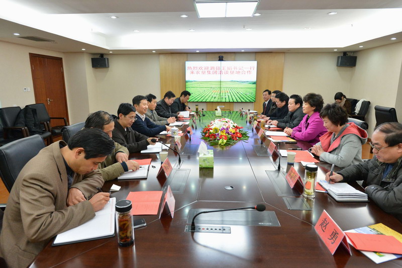 1220 日下午,安徽泗县县委书记王娟、副县长郭金玲及县农委、刘圩镇主要负责人专程来农垦集团对接垦地合作事宜。省农垦集团副总经理王占廷主持了恳谈会,陈仁虎副总经理及相关部室、皖垦种业、潘村湖农场、方邱湖农场主要负责人参加恳谈。会议期间,李卓民总经理亲切会见了王娟一行。