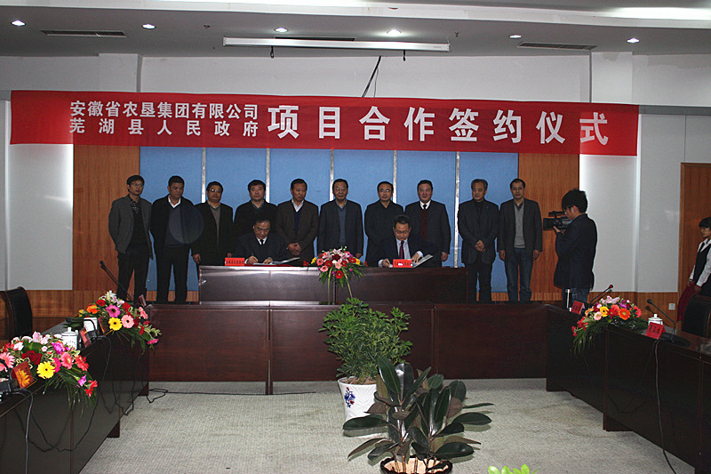 1118,安徽农垦集团与芜湖县人民政府举行项目合作签约仪式,合作内容包括省农垦九连山茶场部分土地整体规划开发、苗木大市场、商住用地开发等项目建设。仪式上,省农垦集团总经理李卓民和芜湖县委书记何友旺先后致辞,简要介绍了合作项目前期工作进展情况,展望了垦地合作前景对签约项目建设提出了具体要求。省农垦集团副总经理程军和芜湖县长黄维群分别代表各方在合作协议上签字。