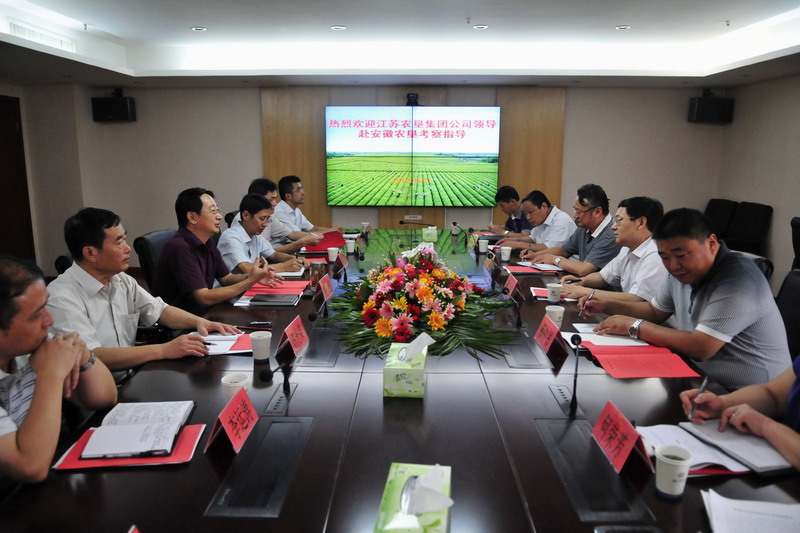 82123日,江苏农垦集团副总经理孙宝成率领东辛、岗埠、云台、南通、江心沙、港等农场场长及农业发展部一行9人来安徽垦区调研考察。安徽农垦集团副总经理刘超、陈仁虎以及办公室、经合部、农水部、资产部负责人给予热情接待并参加了调研活动。李卓民总经理在会见时介绍了近年来安徽农垦创新体制机制推动经济社会发展的情况。