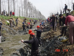 3月24日,大圹圩农场六分场至七分场主干沟地 段,人头攒动,彩旗飘扬,热火朝天。全场近500 名干部职工汇聚在一起,打响了大沟清於的大会 战。场领导徐成银、施广庆、殷文格、杨朝幸、李 家华身先士卒,带头奋战在清於劳动的第一线。领 导们的模范作用使大家深受鼓舞,干劲倍增,干群 们以昂扬的斗志、饱满的热情,克服坡陡於深、劳 动强度大等诸多困难,团结协作、奋力拚搏、苦干 实干,仅一天时间,就完成大沟清於500多米,土 方1500方左右。