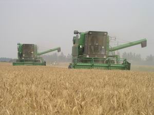为圆满完成今年午收夏种工作,该场于6月3日召开 了由各分场管理人员,二、三产单位领导班子成员 和机关各科室负责同志参加的午收夏种动员大会, 对今年全场午收夏种工作做了周密部署。全场3.2 万亩小麦计划在6月12日前全部收割完毕。根据田 间测产和已收获地块测算,今年全场小麦平均单产 将突破900斤,创建场42年来最高纪录。图为收割 场景。(杨登宏摄)