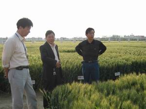 河南省地神种业公司总经理陈清林于5月29日在潘 村湖农场考察合作项目运行情况.隶属于河南省黄 泛区农场的地神种业公司是全国种子行业50强之 一,由该场研发的神麦2号(即原泛麦5号)是具有抗 寒、抗病、抗倒、多穗等特点的超高产新品种。从 2005年底开始,潘村湖农场与地神种业强强联手, 相互合作,由潘村湖农场独享神麦2号在皖东、皖 北和江苏的经营权。由地神种业输入种源和相关栽 培技术的潘村湖农场2000亩神麦2号小麦长势喜 人,丰收在望,据田间测产,平均单产达500公 斤。图为在副场长李先金(右)陪同下,陈清林总 经理(中)在良种繁育基地察看神麦2号生长情况 的情景。(杨登宏)
